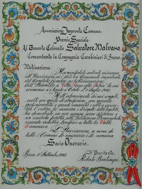 Premio al T. Col. Malavaso dei carabinieri di Breno